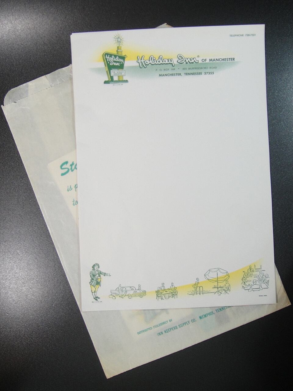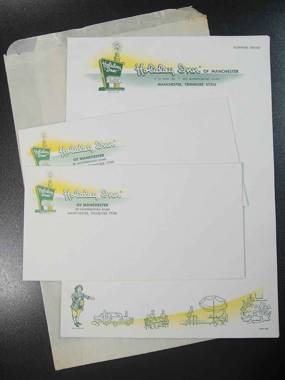 60年代頃のアメリカ、テネシー州の都市マンチェスターにあるホリデイ・インの便箋と封筒&ポストカードセットです。未使用品の便箋7枚、封筒2枚、ポストカード2枚が大封筒にセットになっています。現在はホリデイ イン エクスプレス ホテル&スイーツ マンチェスターになっています。