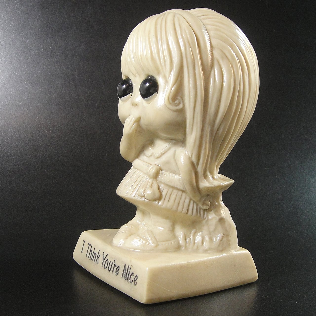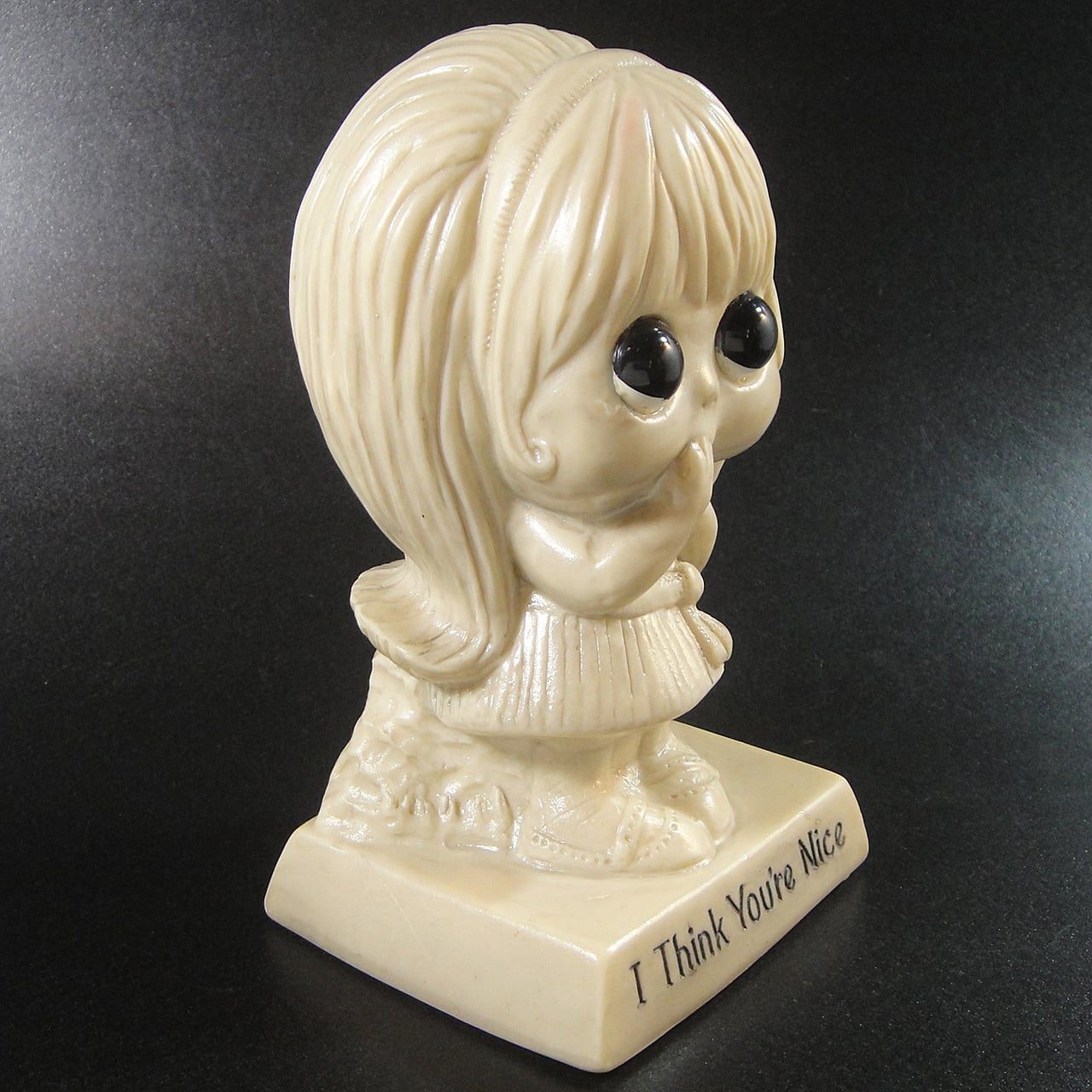 1970年頃のアメリカ製おもちゃ会社ラス・ベリー&ウォレス・ベリー社の女の子ヴィンテージメッセージドールです。メッセージは「I Think You're Nice/あなたは素敵だと思います」です。底にはまだ当時のシールが残っています。