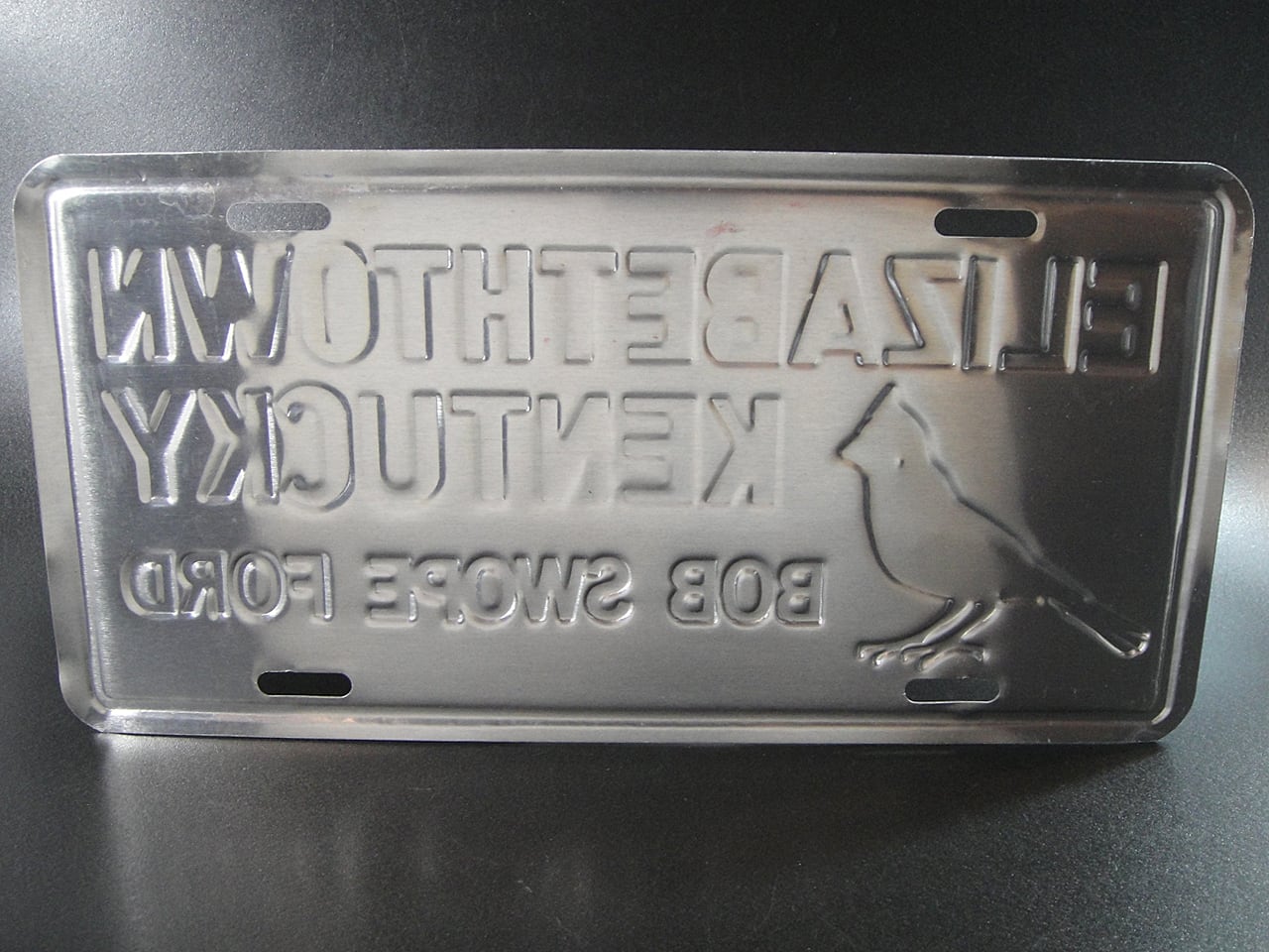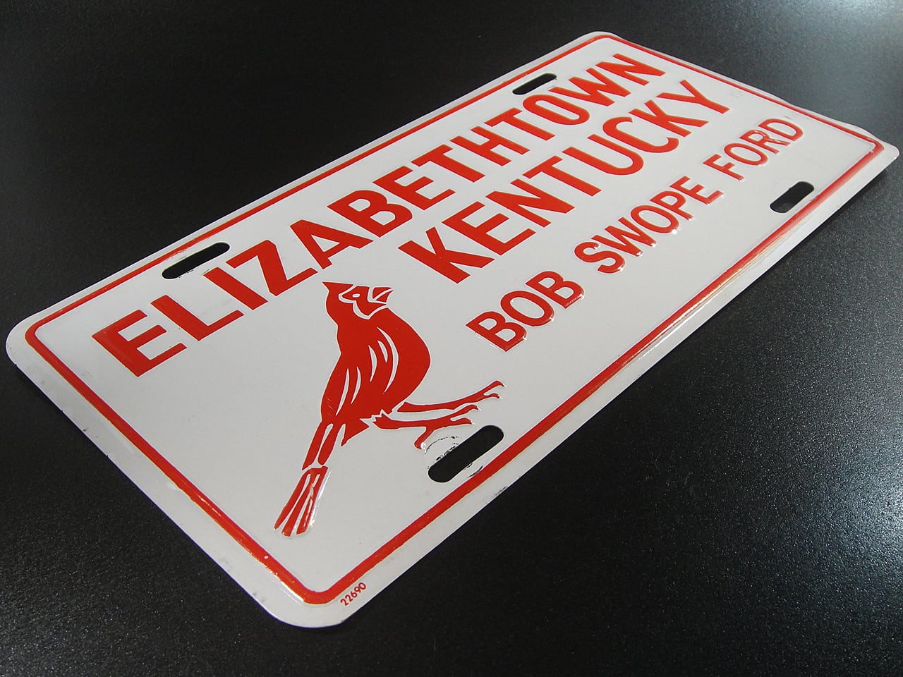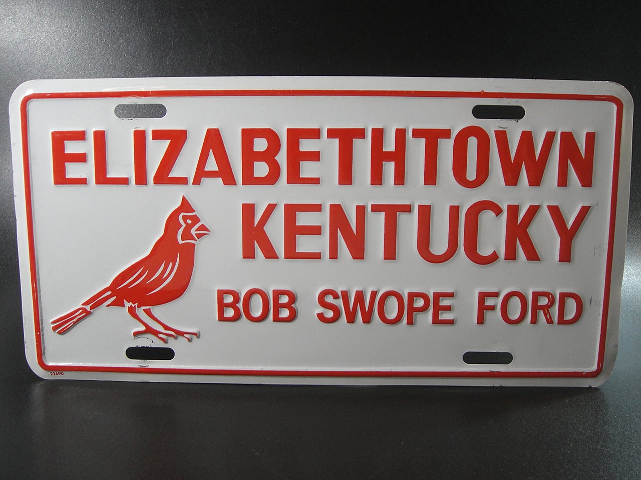90年代頃のアメリカのケンタッキー州の都市エリザベスタウンあるフォードと中古車ディーラーのボブ・スウォープ・フォード用ライセンスプレート です。鳥はケンタッキー州全域で最も広く見られるキツツキです。