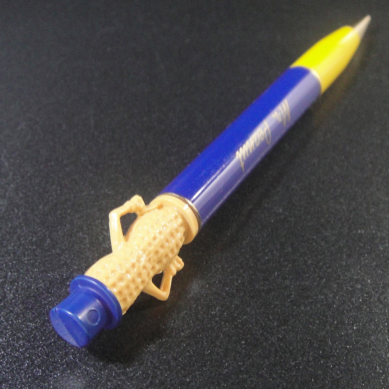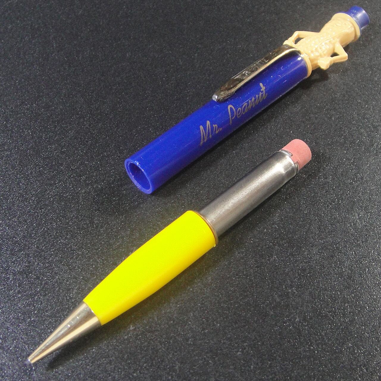 60~70年代頃のアメリカのスナック食品会社プランターズのノベルティでミスターピーナッツのペンシルです。ペンの黄色い部分を回転させると鉛筆芯が伸ばせて長さが調整できます。更に黄色い部分の中には消しゴムと予備芯が入っています。未使用品になります。