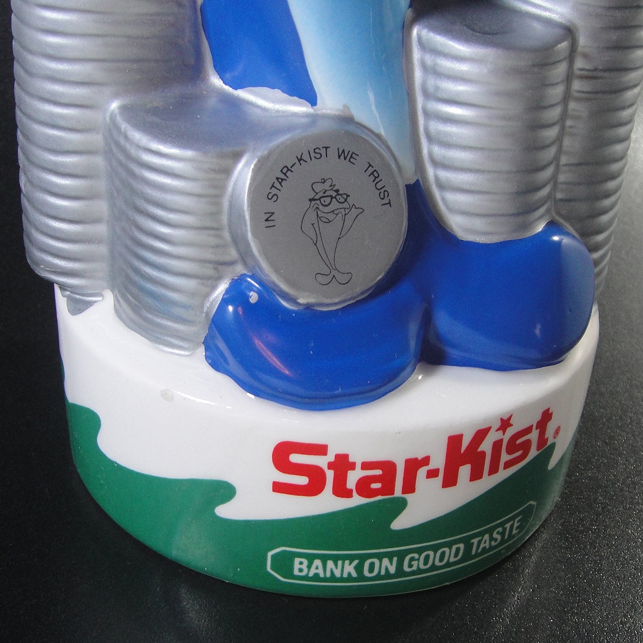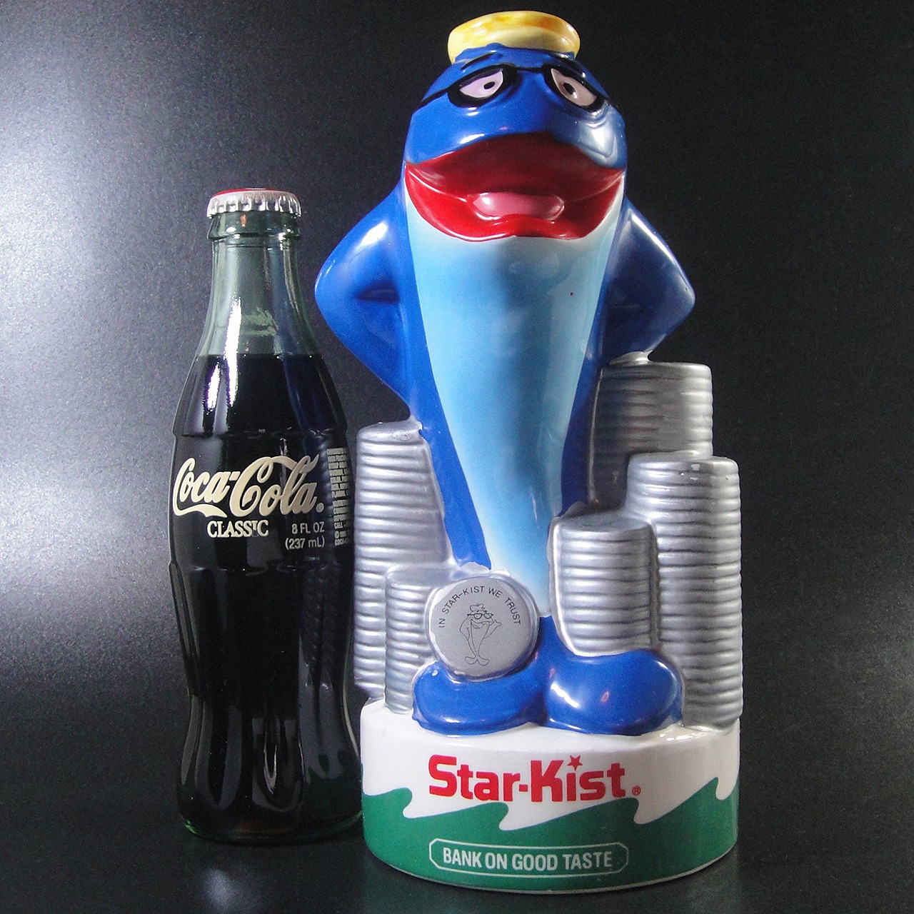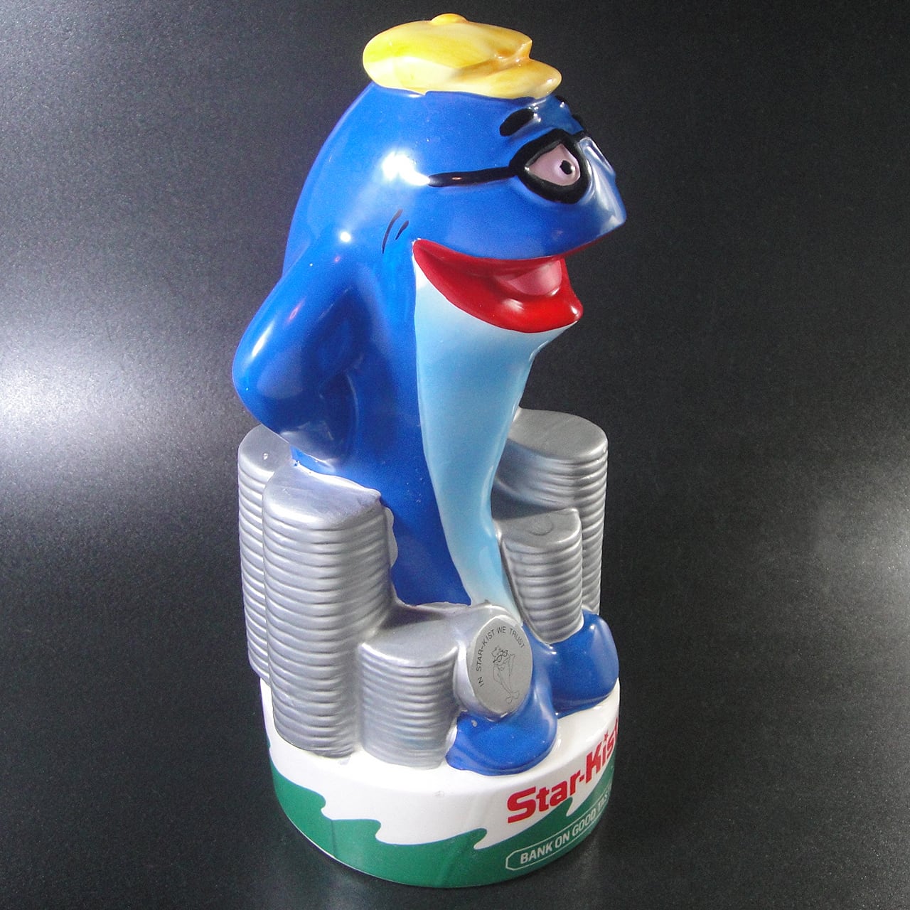 1917年にアメリカで設立されたスターキスト(StarKist)社が製造するマグロのマスコットキャラクターで1988年頃のチャーリー・ザ・ツナ陶器製貯金箱です。1961年頃にマグロ「チャーリー・ザ・ツナ」はマスコットの漫画として登場しましたが、スターキスト社は1963年にH.J.ハインツ社に買収されツナブランドとして残りました。