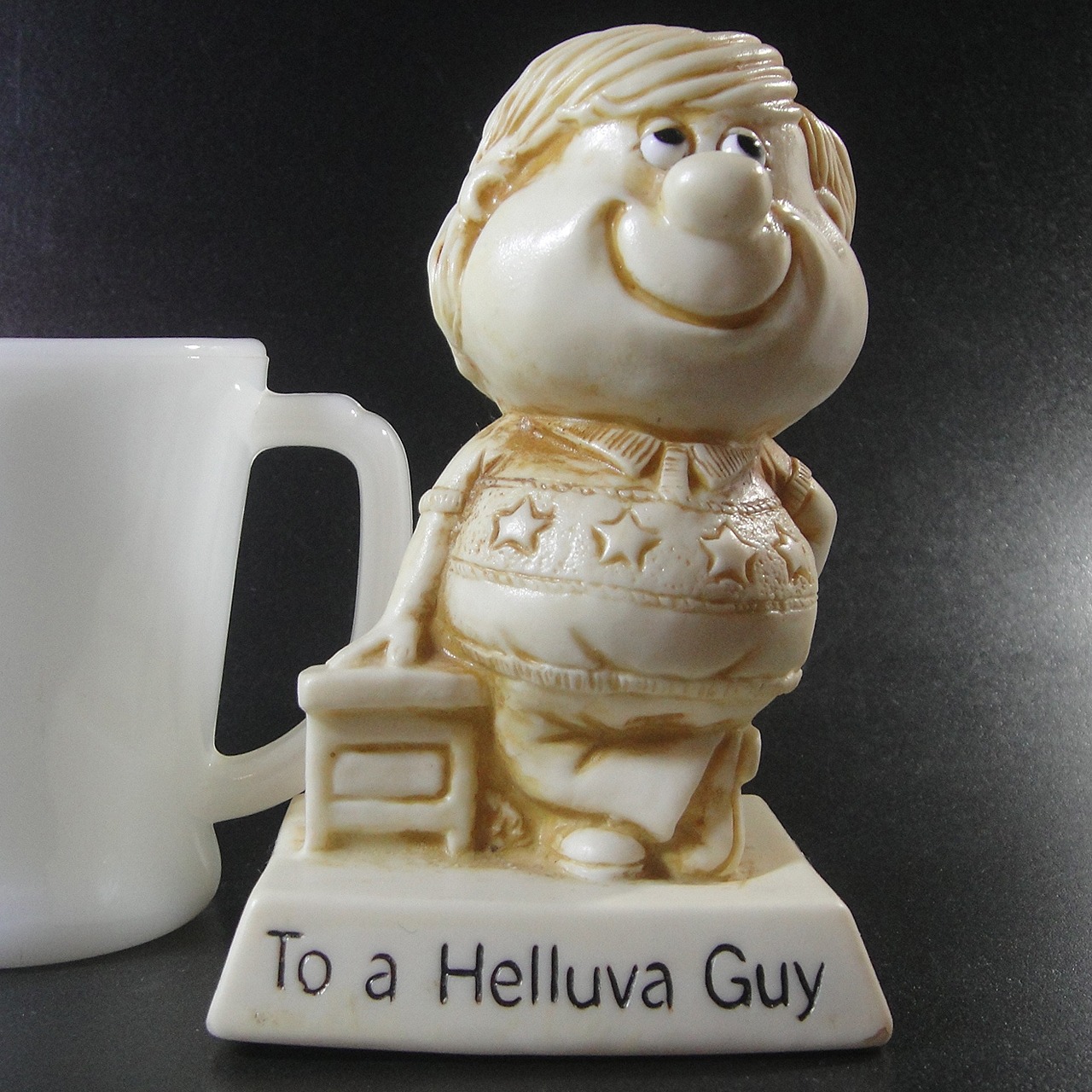 1975年頃のアメリカ製おもちゃ会社ラス・ベリー&ウォレス・ベリー社の男性ヴィンテージメッセージドールです。メッセージは「To a Helluva Guy/すごい奴(男)に」です。