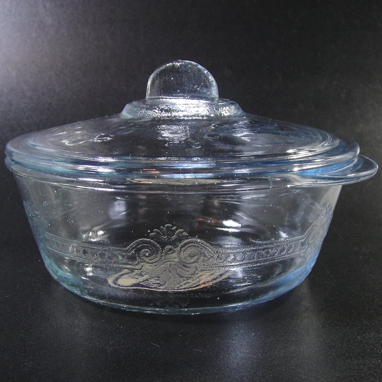 1941~1956年まで製造された小ぶりサイズのアメリカ製ファイヤーキング・サファイヤブルー・キャセロールです。ガラスにエンボスのフィルビー柄が入ったシリーズです。