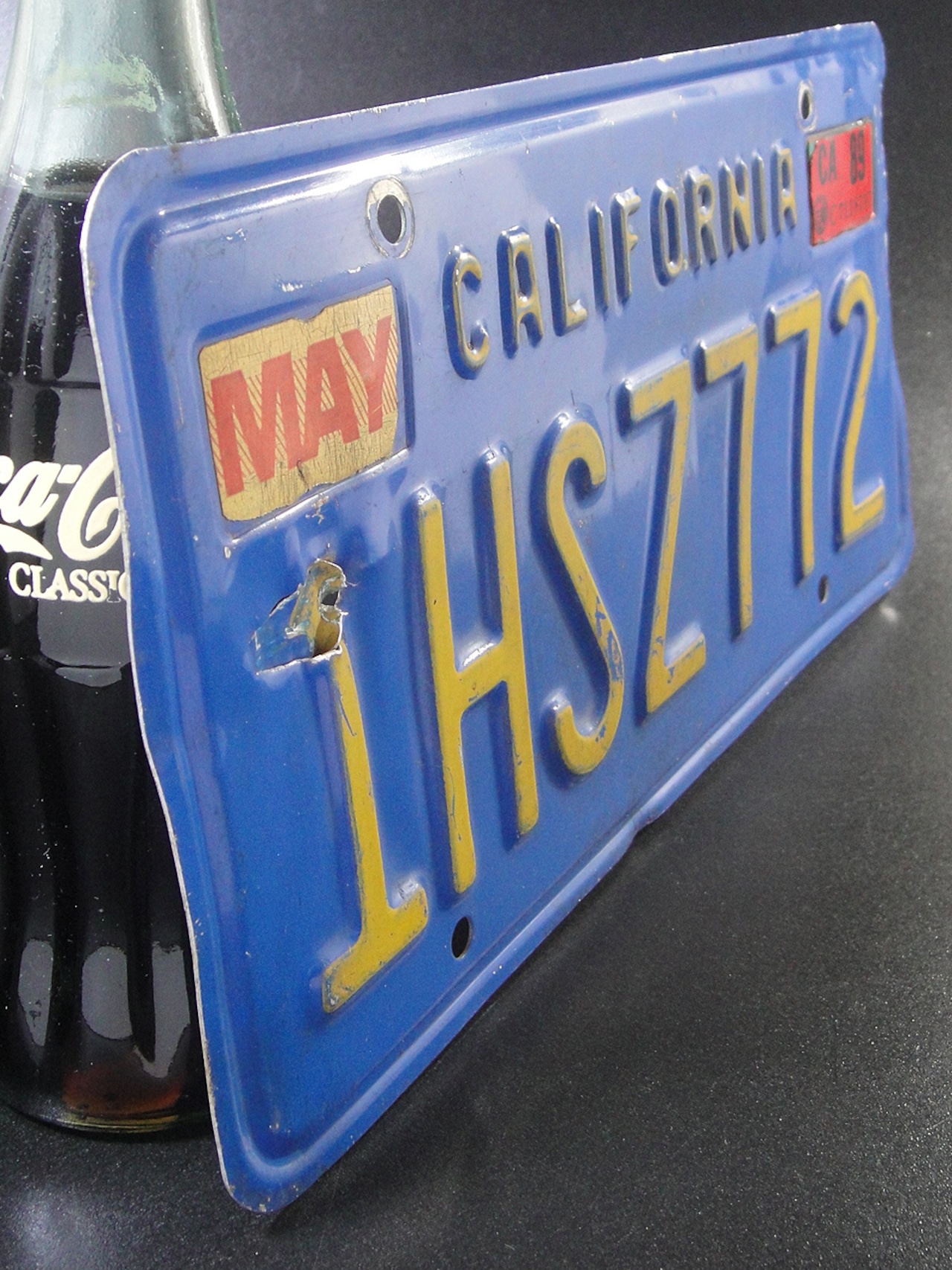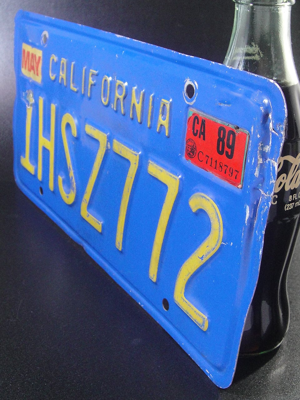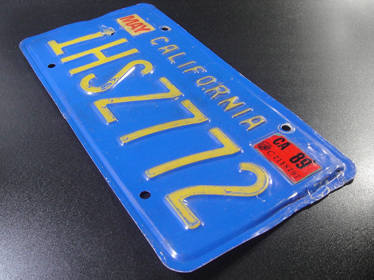 アメリカのカリフォルニア州で実際に使用され89年で廃車になったヴィンテージライセンスナンバープレートです。カリフォルニア州のブルーライセンスナンバープレートは、主に60年代後半から80年代前半頃にかけて発行されていました。