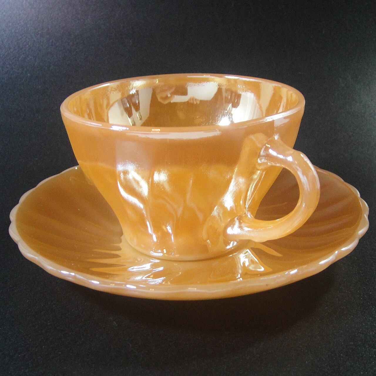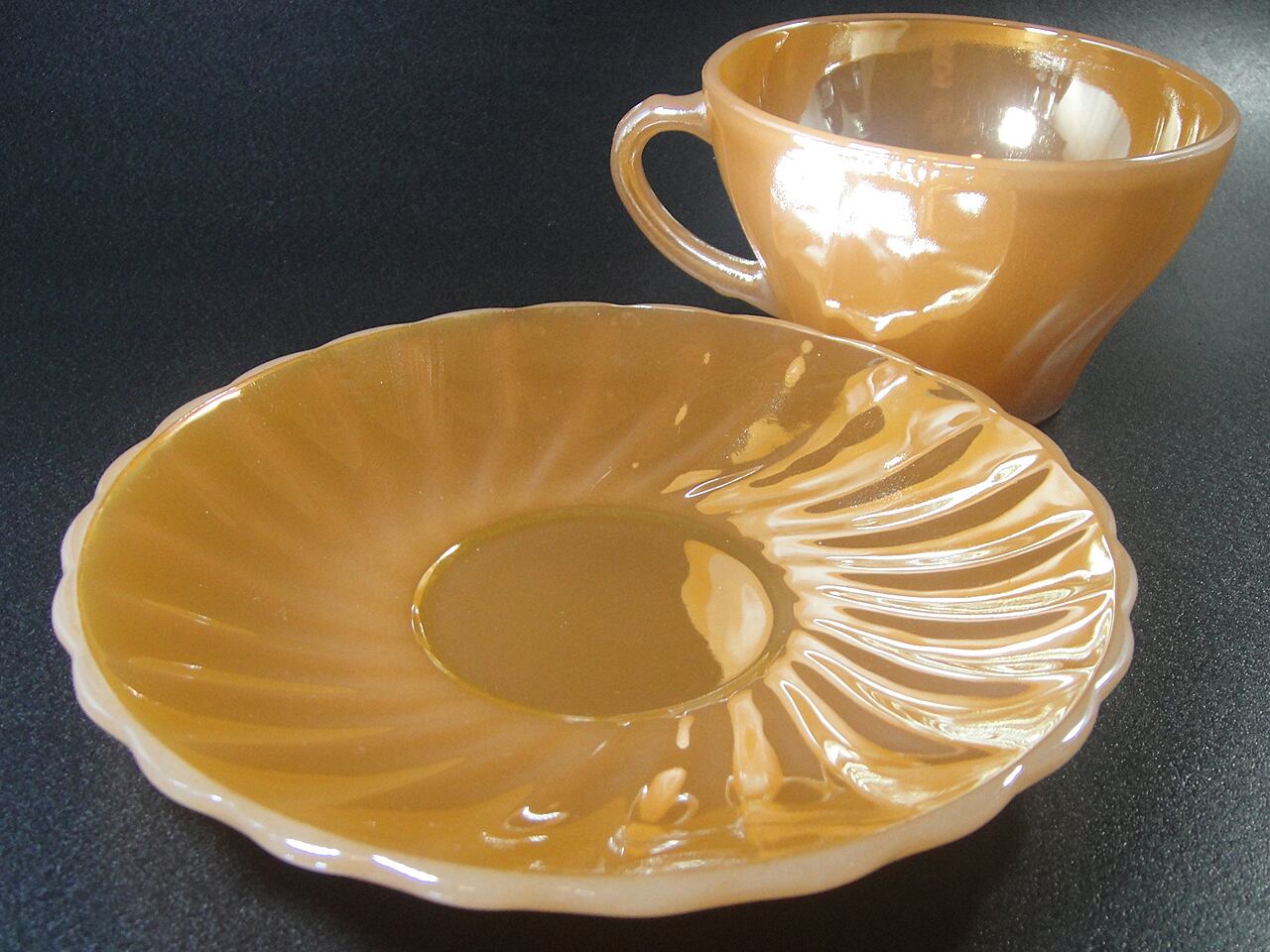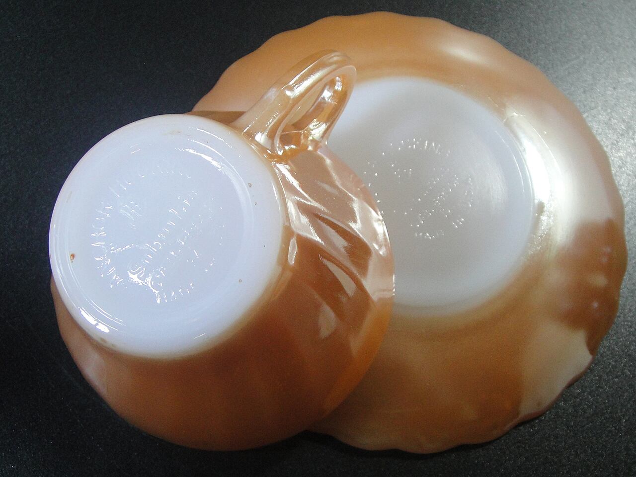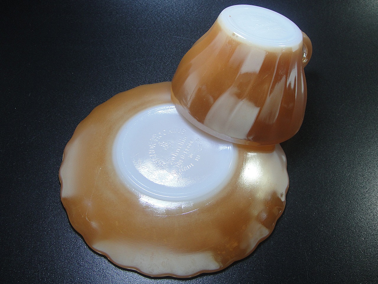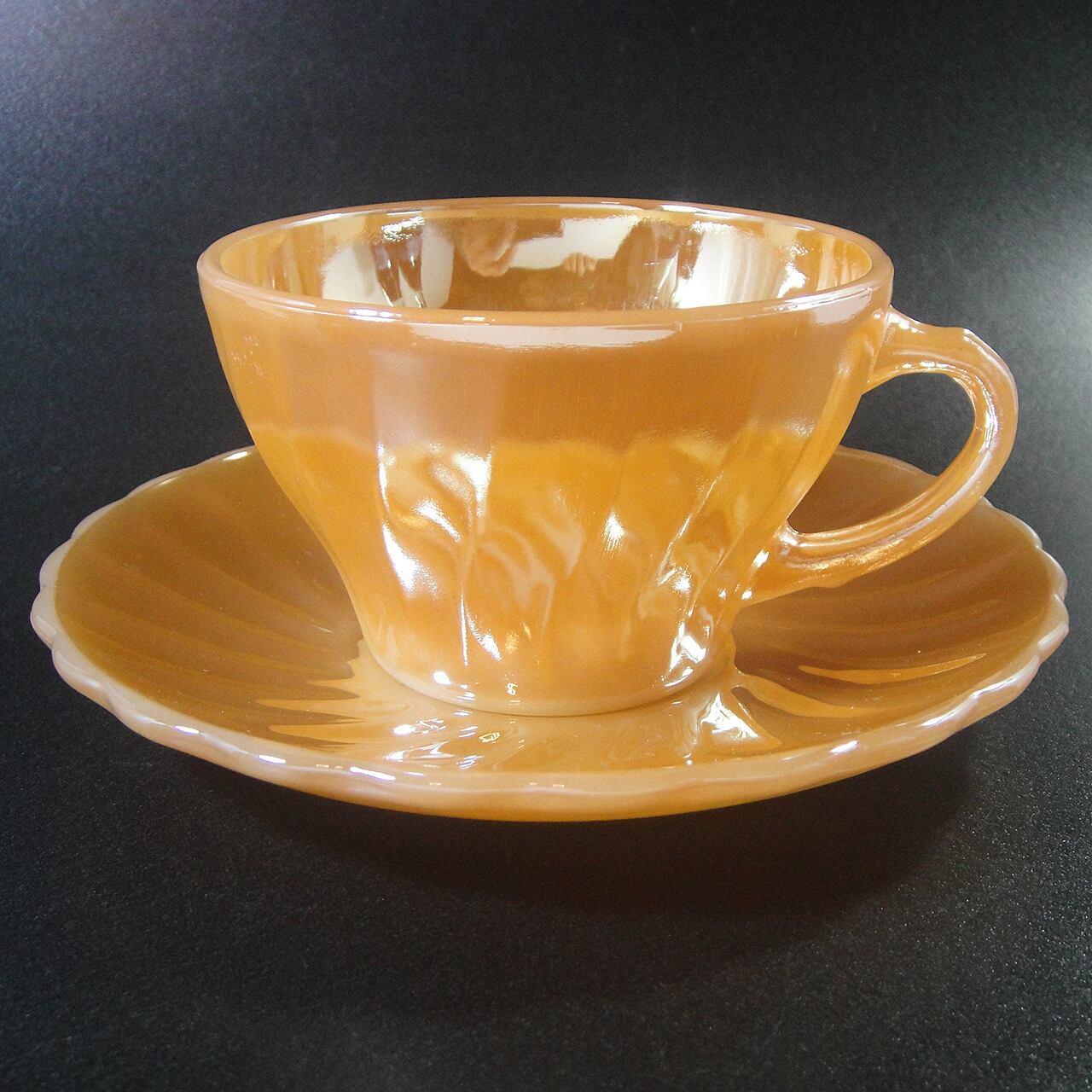 70年代後半頃のアメリカ製アンカーホッキング サバ―ビアシリーズのピーチラスター シェル カップ&ソーサーです。貝殻をモチーフにした緩やかなカーブと縁が特徴のシェル(Shell)タイプです。カップ&ソーサーの刻印は共にANCHOR HOCKING Suburbia OVEN -PROOF MADE IN U.S.A.です。