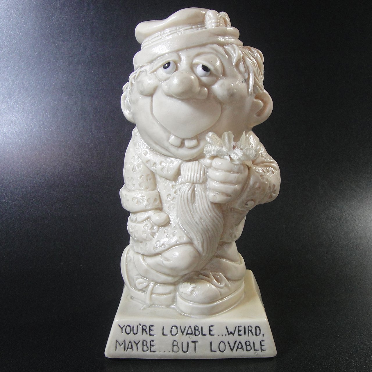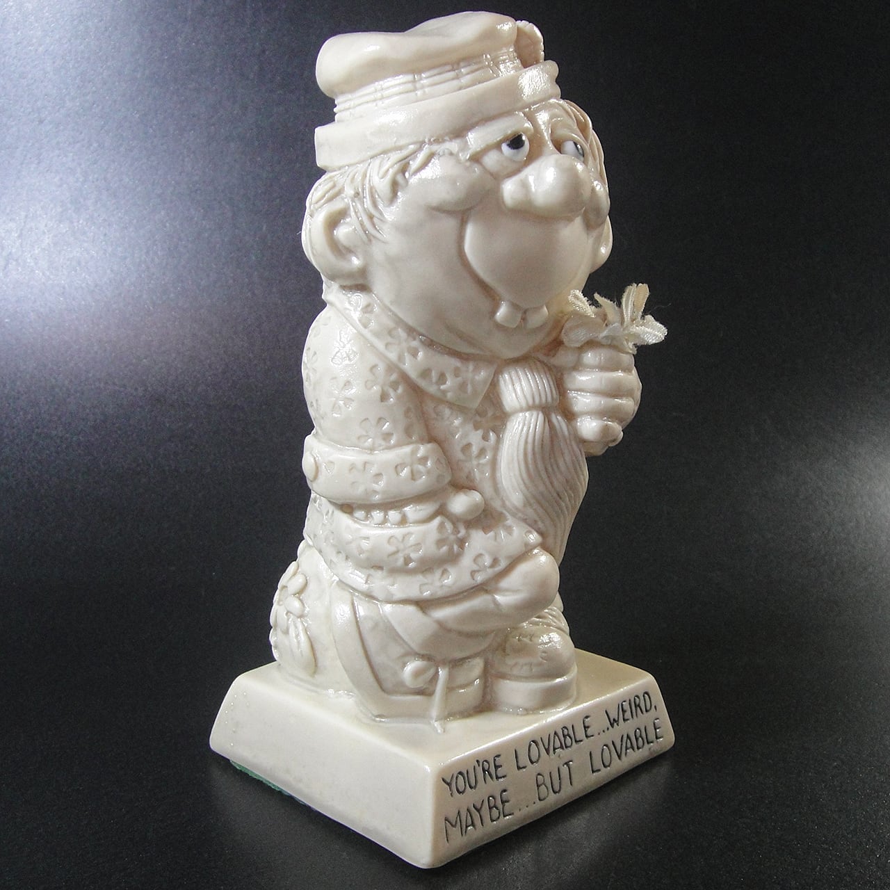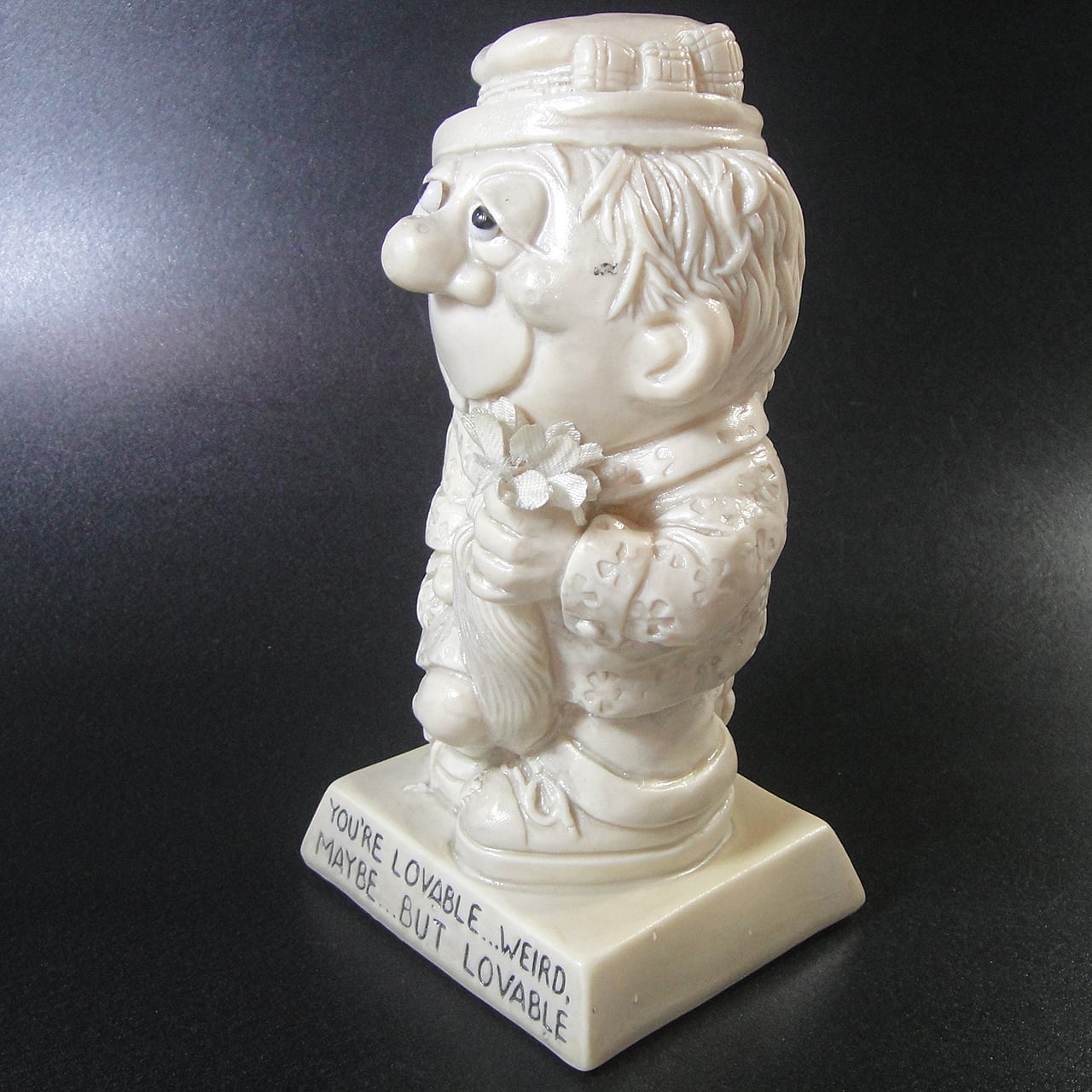 1973年頃のアメリカで大流行した「メッセージドール」と呼ばれるヴィンテージのフィギュアです。ウォレス・ベリー社で製造されたの男性(変な奴 )ヴィンテージメッセージドールのメッセージは「あなたは愛すべき人…ちょっと変わっているかもしれないけど…でも愛すべき人です」です。
